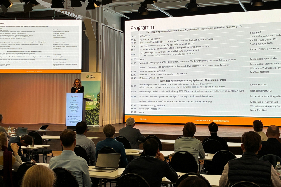Den Auftakt zur Tagung gestaltete Thomas Brose, Geschäftsleiter KB-EU, mit einer Vorstellung des Klima-Bündnis Europa. Mathias Nabholz, Präsident KB-CH, erläuterte seinerseits das Engagement der Schweizer Städte und Gemeinden innerhalb dieses Netzwerks. Danach stand der Vormittag ganz im Zeichen der Negativemissionstechnologien (NET). Cyril Brunner von der ETH Zürich verdeutlichte, dass für das Erreichen von Netto-Null die Emissionsreduktion zwar zentral bleibt, die CO₂-Entfernung aber unverzichtbar ist. Er stellte ein breites Portfolio an Methoden zur CO₂-Entfernung vor und diskutierte, welche für die Schweiz voraussichtlich relevant sein werden (z.B. Bioenergie mit CO₂-Abscheidung und -Speicherung BECCS). Eine der grossen Herausforderungen bestehe darin, diese Methoden rechtzeitig auf den erforderlichen Massstab zu bringen. Einblicke in die nationale Klimapolitik und die Entwicklung der rechtlichen Rahmenbedingungen gab Sophie Wenger vom BAFU. Sie betonte die wichtige Rolle von Städten und Gemeinden bei der Anwendung von NET und hob hervor, dass sie sich dabei an der nationalen Klimapolitik, insb. dem KIG, orientieren können. Zum Abschluss des Vormittags präsentierte Luca Christen von Climeworks die Direct-Air-Capture-Technologie seines Unternehmens, mit der CO₂ direkt aus der Luft gefiltert und dauerhaft im Boden gespeichert wird.
